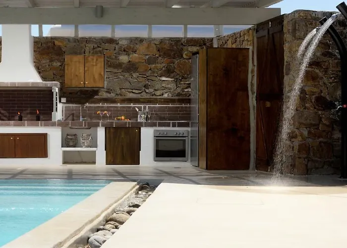 The 2-bedroom Elegant Mykonos Villa is set in Mykonos Town, approximately a 10-minute drive from Nammos Mykonos and 950 metres from Paralia Megali Ammos. It includes WiFi throughout the property along with free private parking, an outdoor swimming pool and a sunbathing terrace on-site.